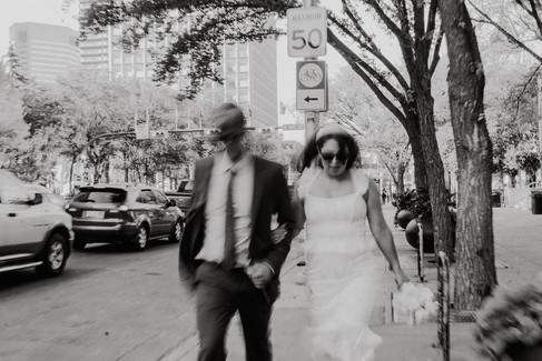 After the ceremony, Justina and Joseph, along with their close-knit group of friends and family, embarked on a fun-filled adventure through downtown Calgary. Their chic and lively photo session captured the essence of their love and the vibrant energy of the city.